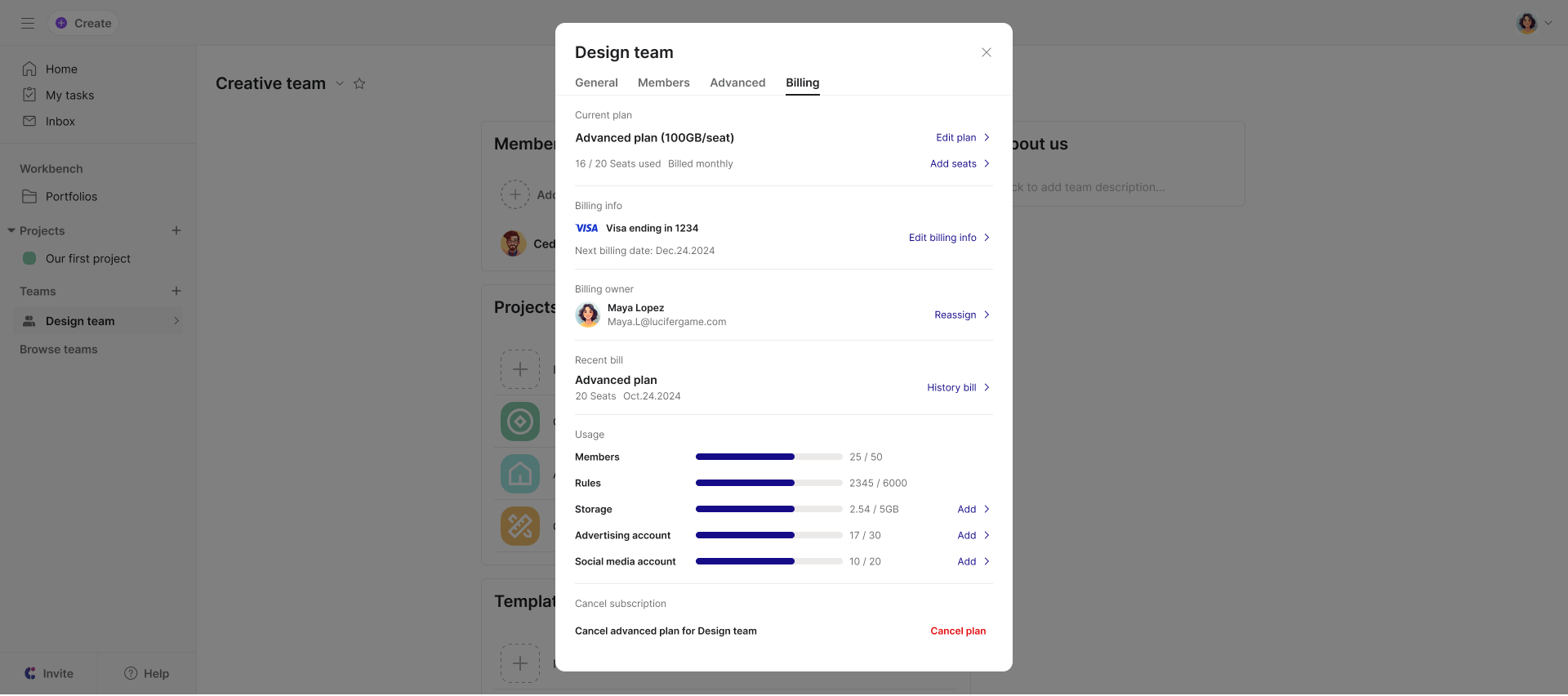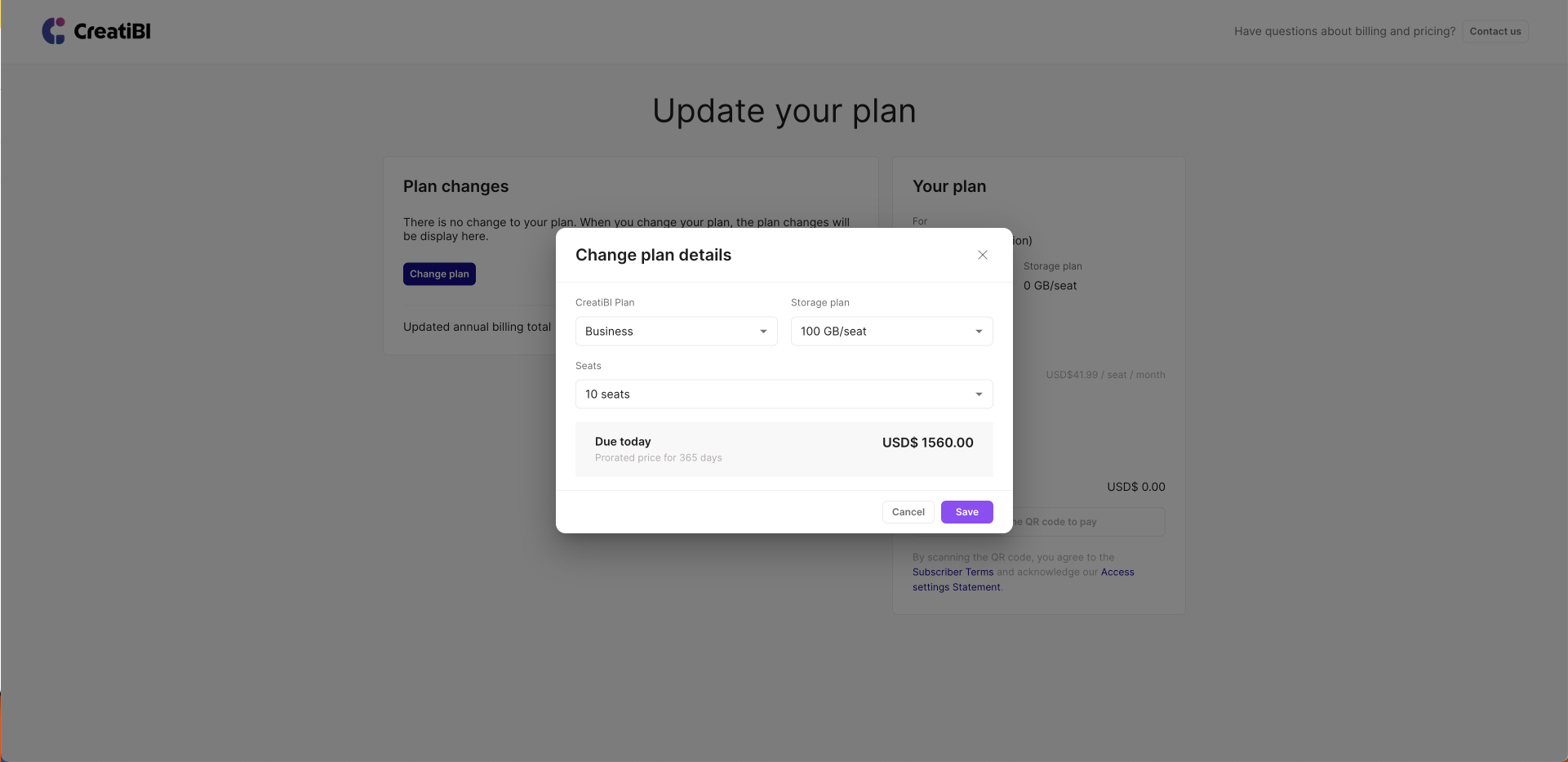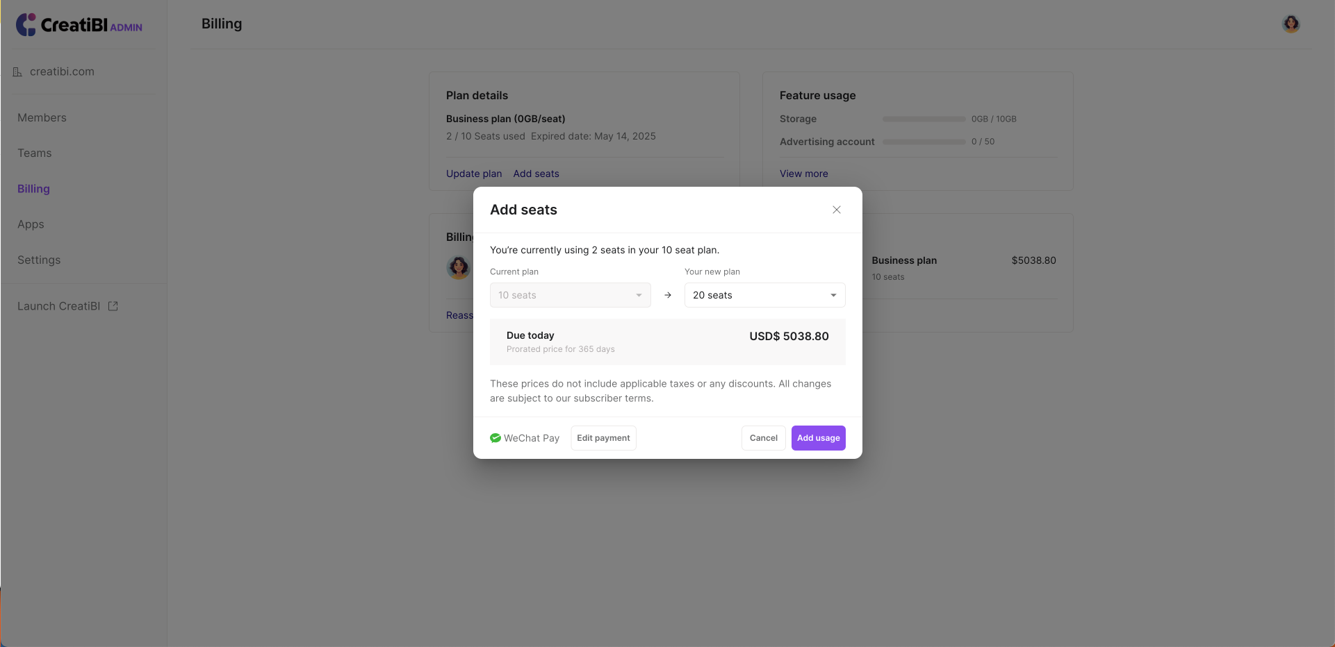 Updating your subscription plan allows you to change your subscribed features, number of seats, and auto-renewal period as needed.