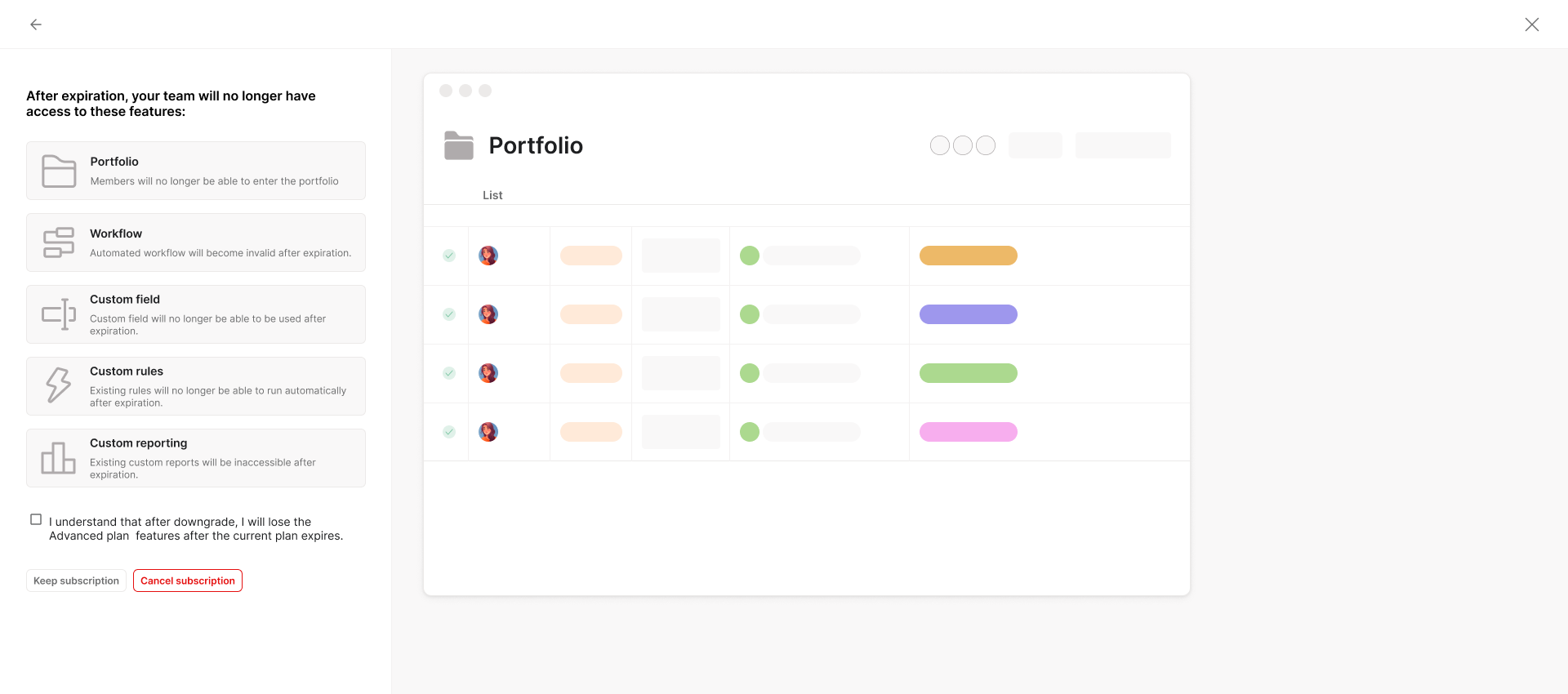 > If you're on an auto-renewal subscription, any downgrades to your plan or seat count will apply from your next renewal date onwards. Until then, you'll retain access to your current plan's features.