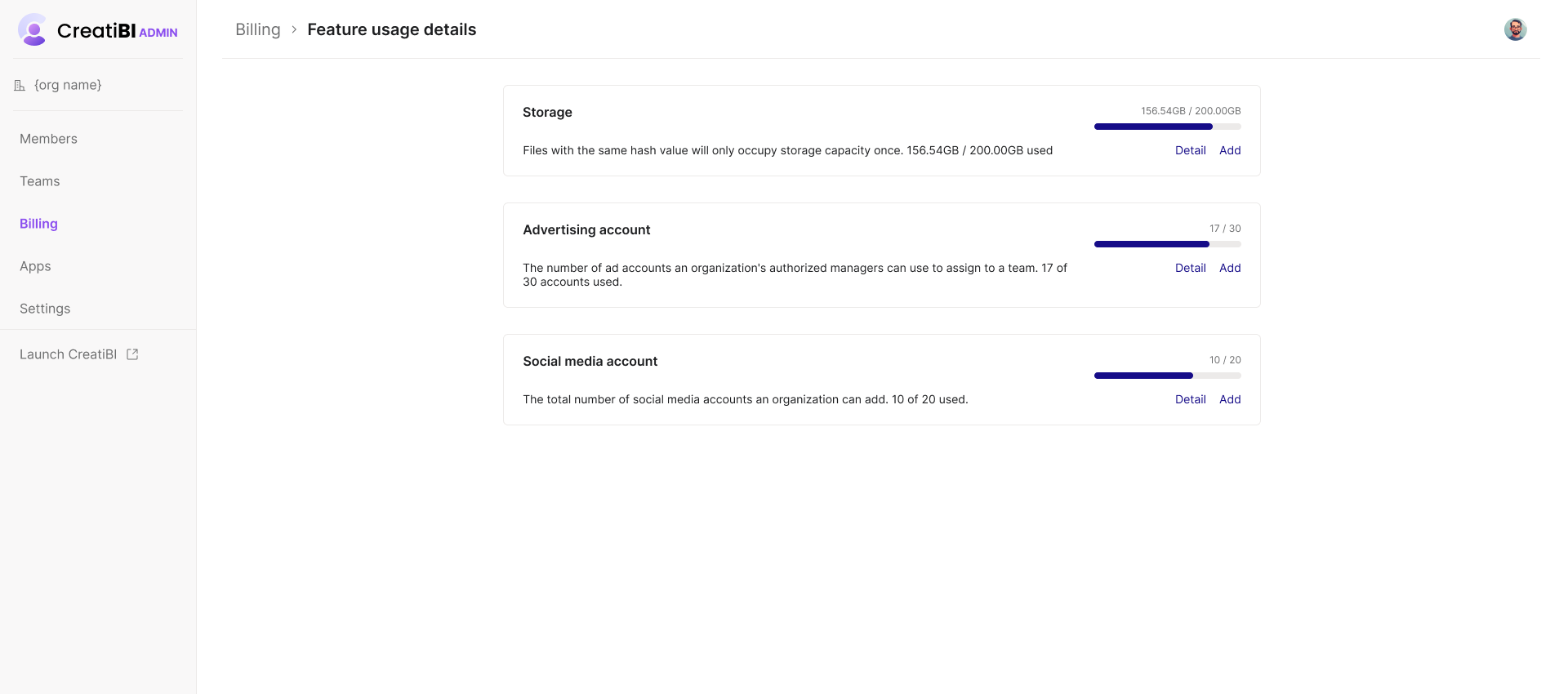 Feature usage lets you monitor your feature use. If you need more than the basic allocation, you can purchase extra usage. CreatiBI provides basic quotas for storage, ad accounts, and social media accounts based on your plan and number of seats. See the table below for more details: