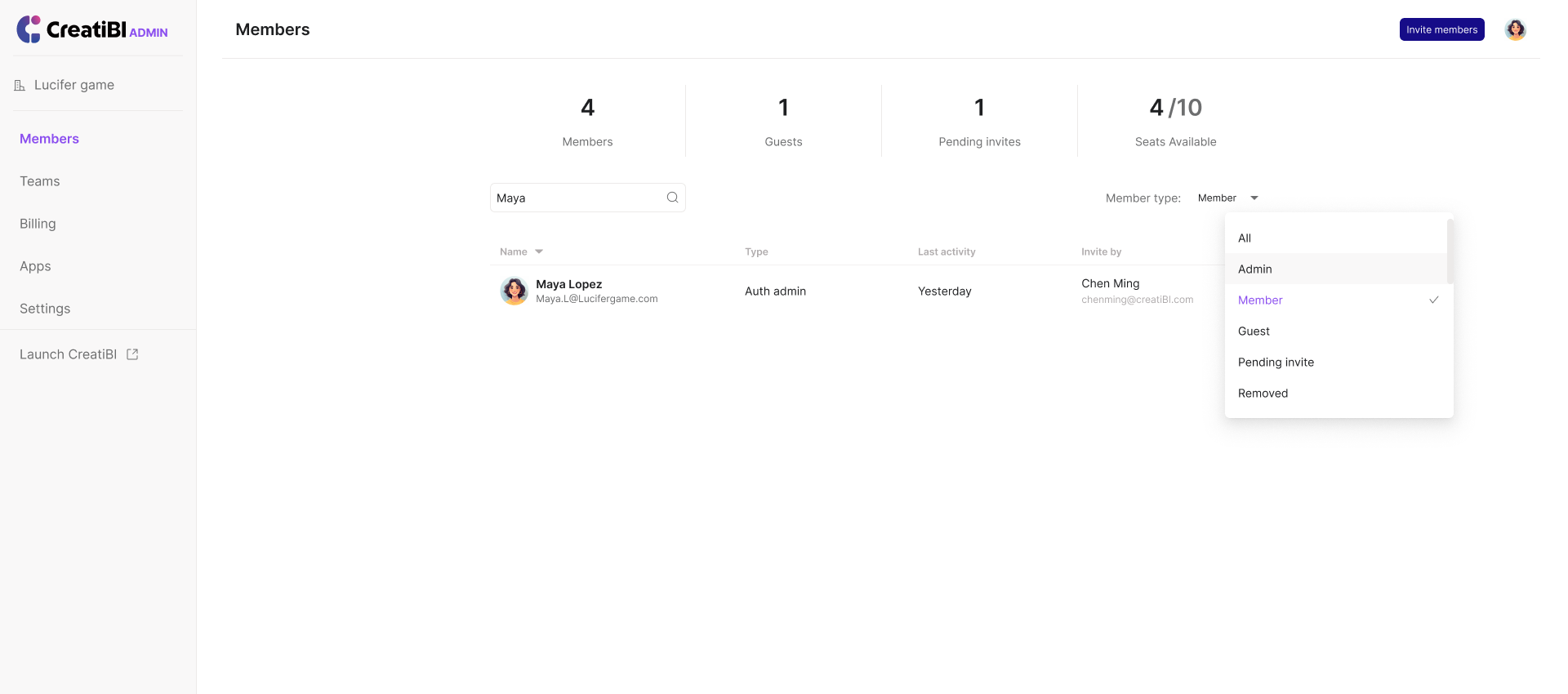 Filter: Supports Six filter options including All, Admin, Member, Guest, Pending invite, and Removed. Members are shown by default.