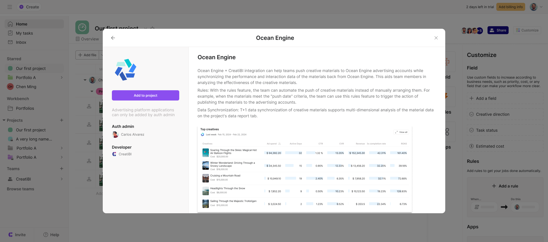 1. Log into CreatiBI and locate any project with the Ocean Engine app integrated;