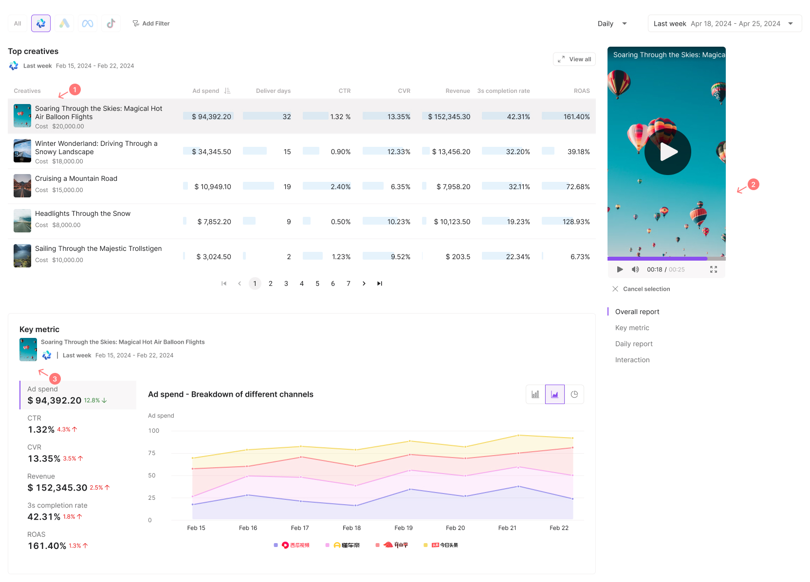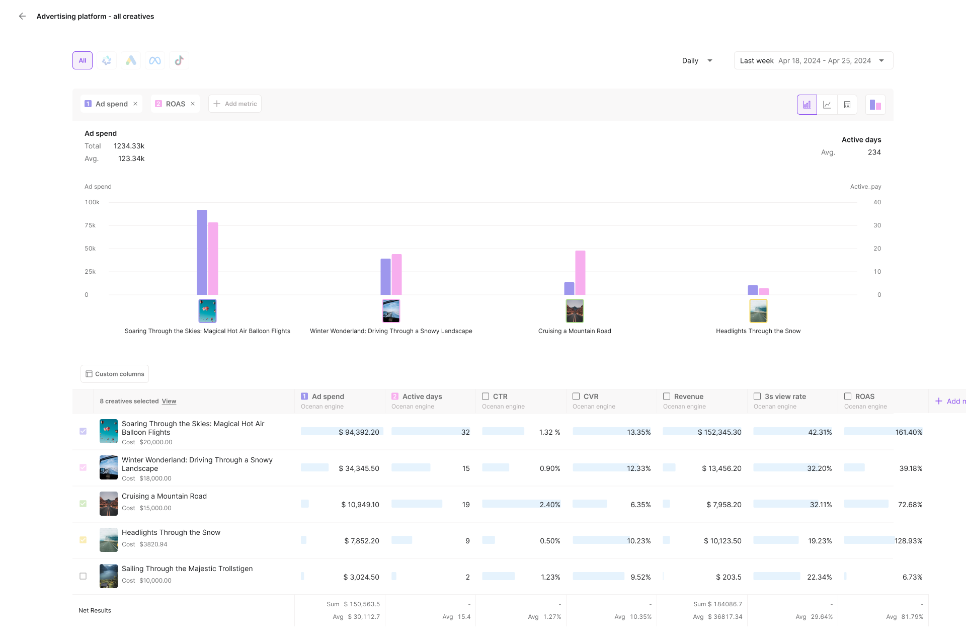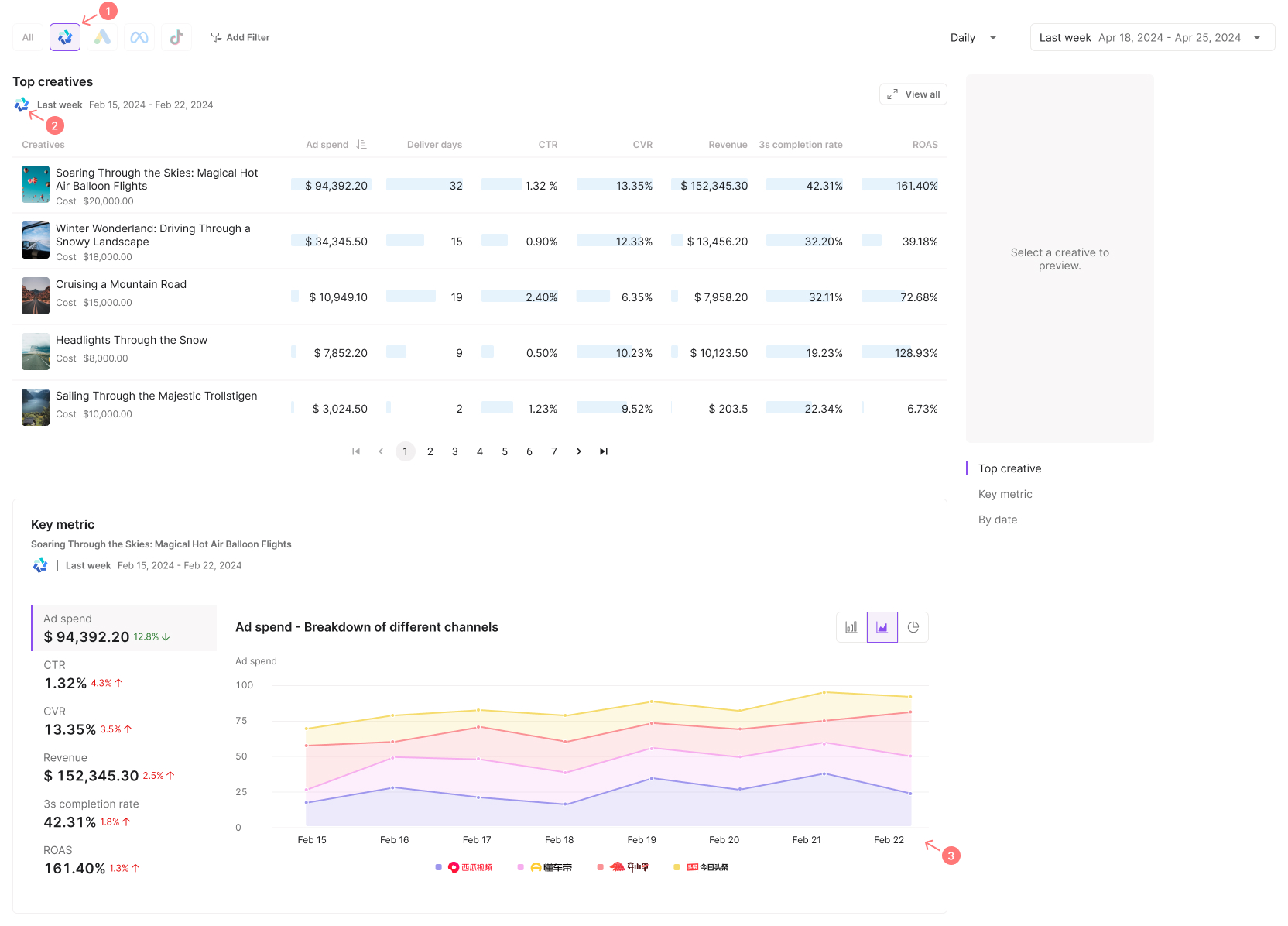 Check the key metrics such as "Ad spend", "CTR", "CVR", etc. to measure your creative performance on all ad platforms;
