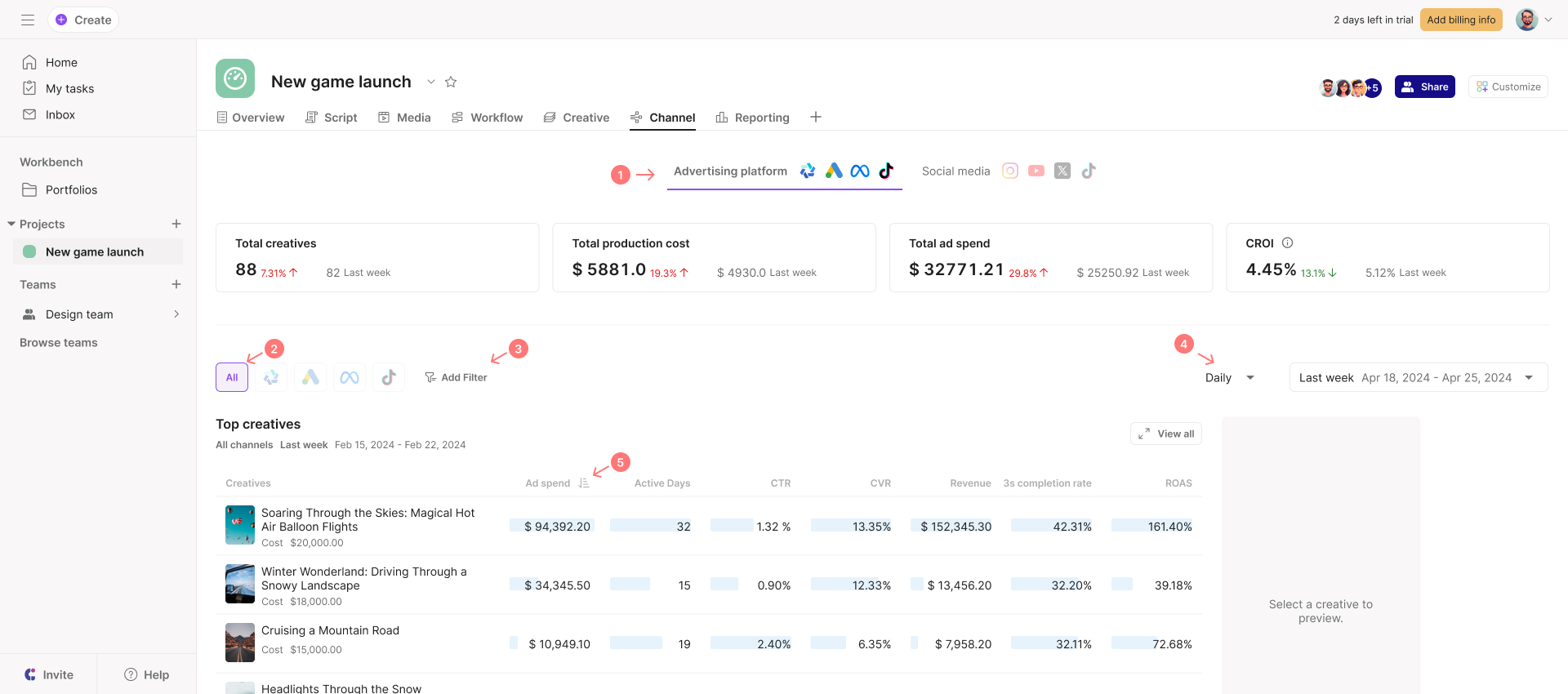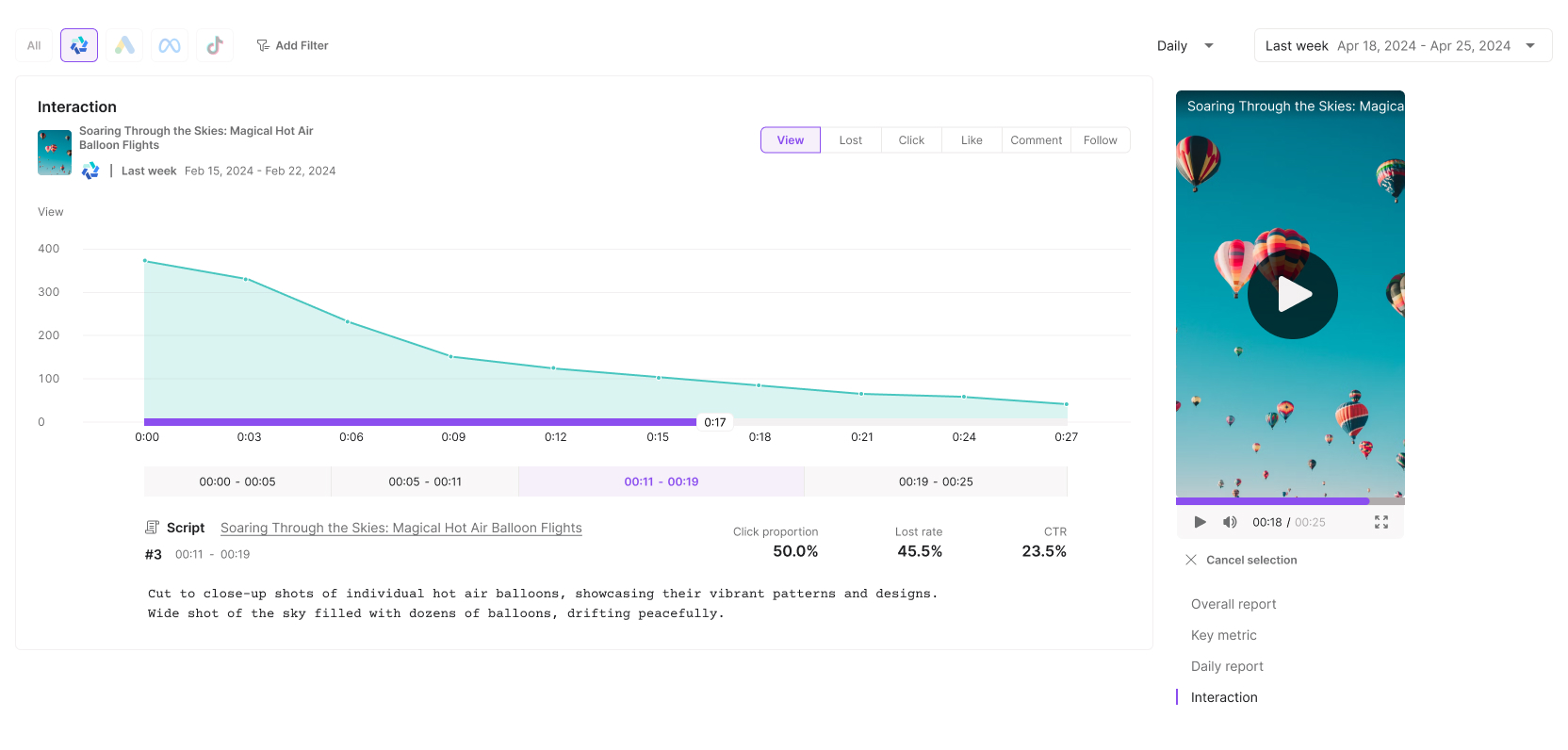 Scroll down to find details about the creative performance on (your target) ad platform with various interactive charts over different time frames;