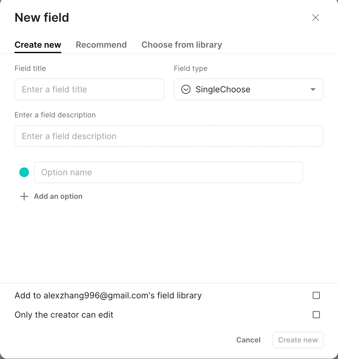 如果您创建一个新字段,请命名该字段并选择字段类型;